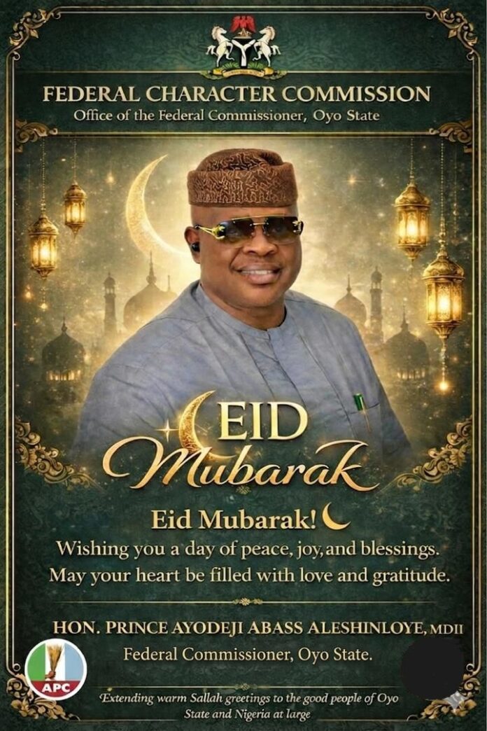 The Federal Character Commissioner representing Oyo State, Prince Ayodeji Abass Aleshinloye, MDII has extended warm felicitations to Muslim faithful across Oyo State and Nigeria at large on the joyous occasion of Eid Mubarak.